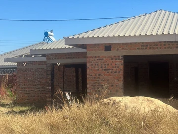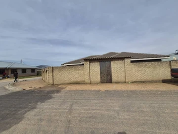 3 spacious bedrooms, main bedroom with ensuite, Open plan lounge, dining & kitchen, seperate bathroom & toilet, tiled & ceiling, 5kva solar system, borehole and tank installed, Walled & gated.
