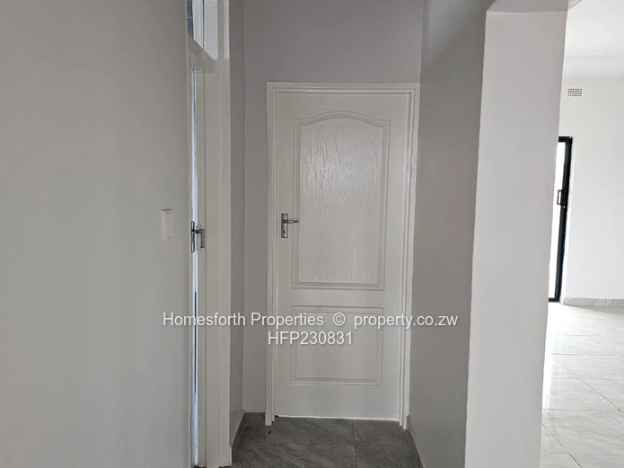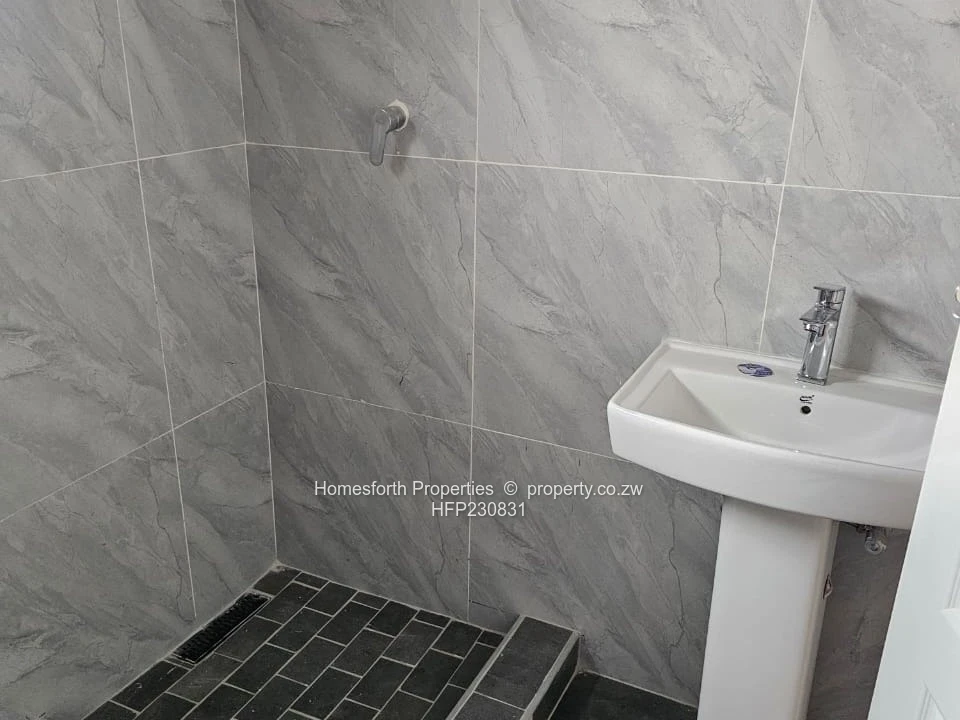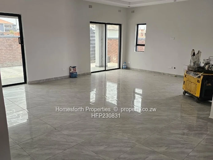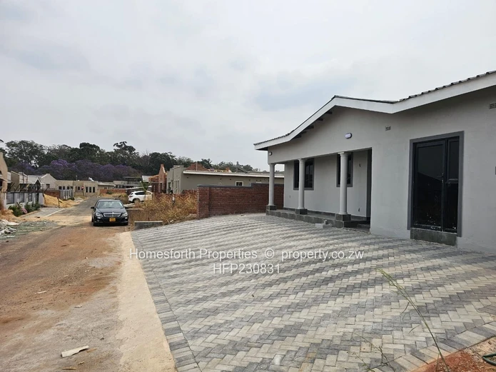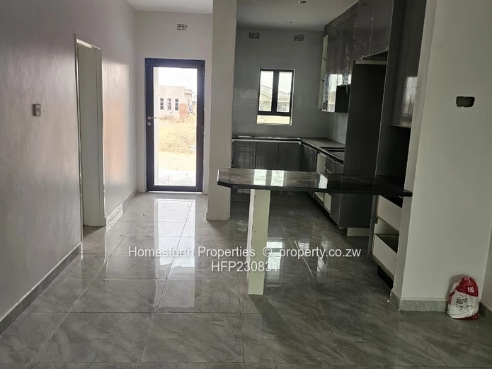Stunning newly finished 3-bedroom, 1-bath home in Arlington, Harare South — built on a neat 320 m² stand with approximately 300 m² of modern living space. The property greets you with an expansive paved driveway and secure brick boundary wall, perfect for multiple vehicles and low-maintenance outdoor living. A covered veranda with classic columns leads into bright, open-plan living and dining areas finished in high-gloss grey tiles and large sliding doors that flood the home with light.