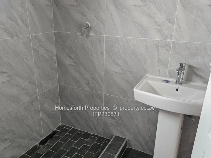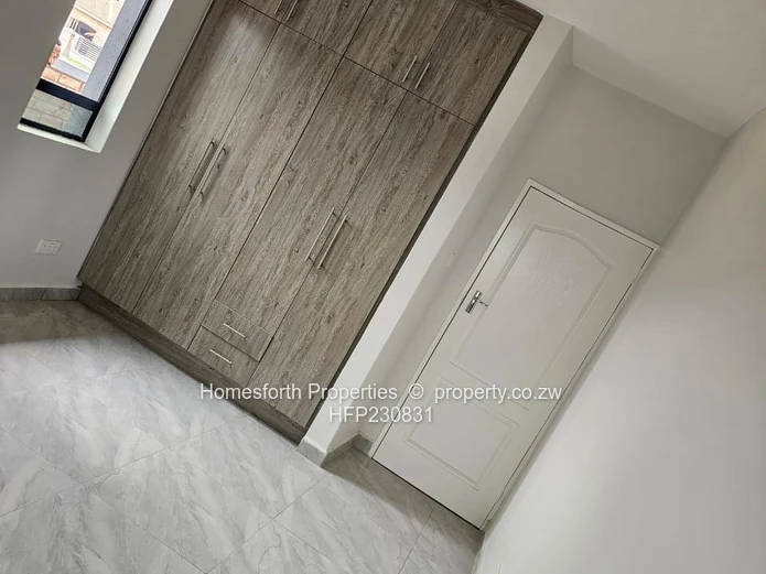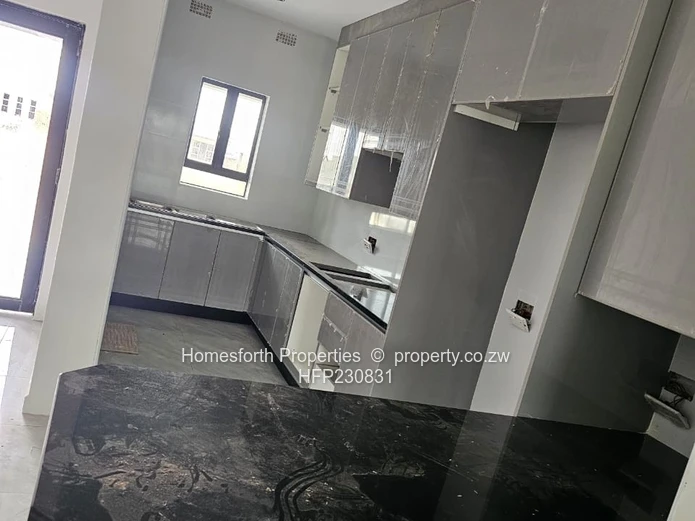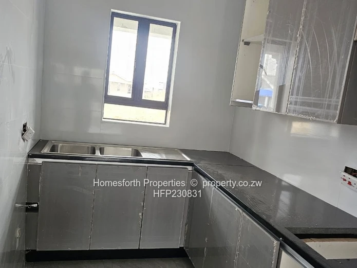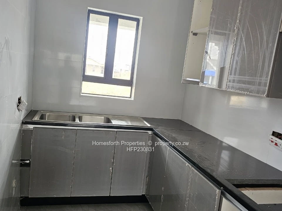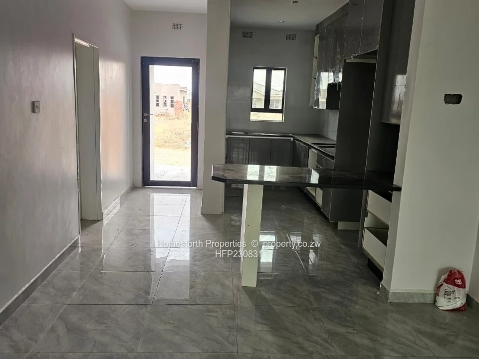 Inside find a contemporary fitted kitchen with sleek granite countertops, ample cabinetry and a breakfast bar — ideal for entertaining. Bedrooms feature built-in wardrobes and quality finishes. The bathroom is fully tiled with modern fittings and an efficient shower area. Practical extras include municipal water connection, reliable sewer system and on-site water storage tank visible at the rear. Located within a controlled-access neighbourhood, this home offers security and peace of mind while being close to local conveniences in Harare South.